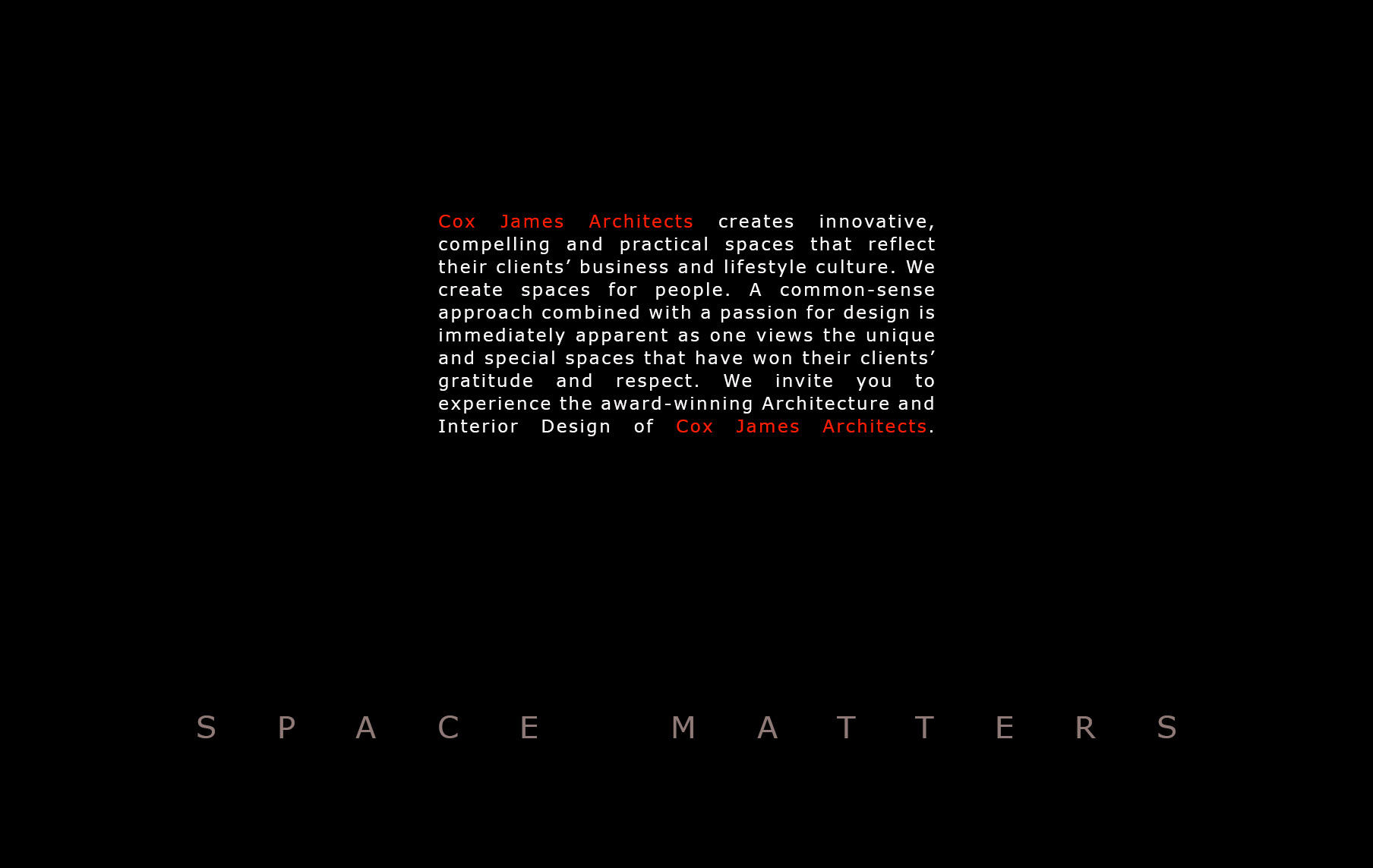 Cox James Architects creates innovative, compelling and practical spaces that reflects their clients' business and lifestyle culture. We create spaces for people. A common-sense approach combined with a passion for design is immediately apparent as one views the unique and special spaces that have won their clients' gratitude and respects. We invite you to experience the award-winning Architecture and Interior Design of Cox James Architects.